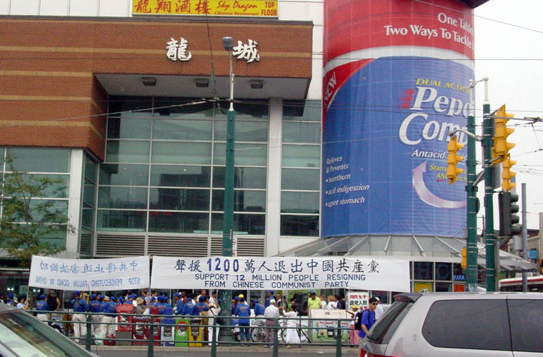 在演奏的间隙,退!党!服务中心的义工通过大喇叭读《·九·评*共产党》,声音在整个唐人街回荡。