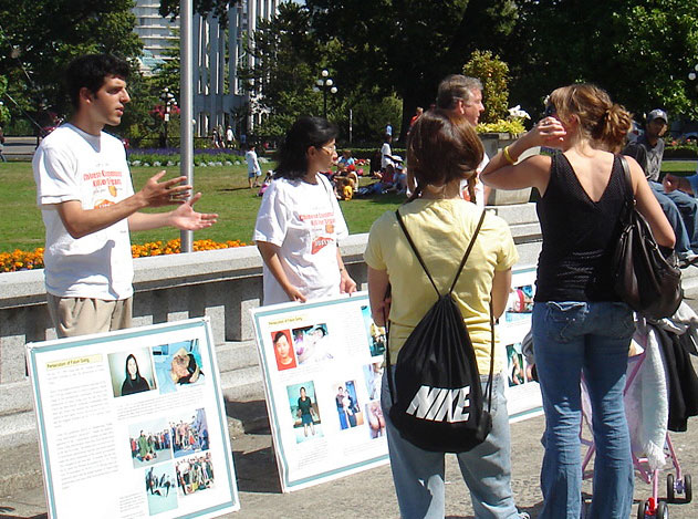来自法国、坦桑尼亚和斯堪的纳维亚半岛的游客,听到此消息后都感到非常震惊。一位美国妇女表示从未听说过这样的事情,并希望我们能说服联合国,对此进行必要的全面调查。民众都很愿意接受相关资料,许多在校学生则认真观看迫害真相的图片。