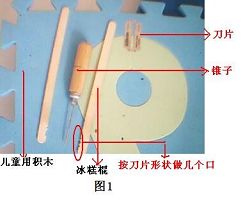 一. 选材:(1) 儿童用的泡沫积木、刀片、冰糕棍、锥子。如图1(2)长20cm宽4cm的三合板二块。(3)文具盒。