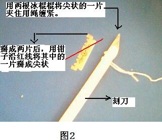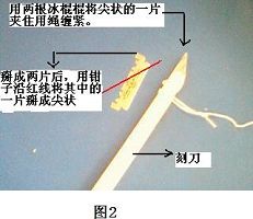 二. 刻刀的制作:(1)将刀片掰成两半。(2)用冰糕棍将掰后的刀片夹在一起用绳缠好。如图2