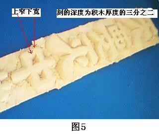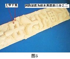 六. 将扎过眼的积木沿扎的眼用刻刀刻出字形,要上窄下宽,也就是刻时刻刀要有一定的斜度。