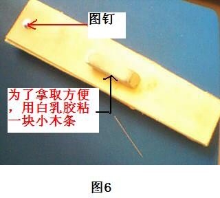八. 将三合板的一端钉上一个图钉,(这样的目地是为了晚上用时知道上下,不至于印反),再将图5用白乳胶粘在这个三合板上。如图6。