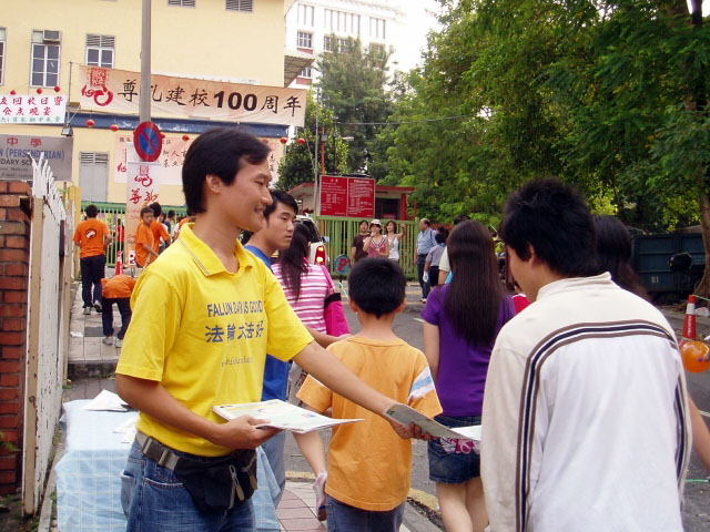 为了让更多民众了解什么是法轮功以及发生在中国的迫害真相,马来西亚法轮功学员也在该校校门两旁派发真相资料予公众;大部份的人都接过学员所派发的资料,有些人听学员讲完真相后才走进会场,一些人士则对炼功表示有兴趣。