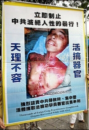 文章说,维多利亚法轮功学员奎因(Joan Quain)与4位同修于星期四在市政府,展示了令人毛骨悚然的被害致死的法轮功学员的照片。