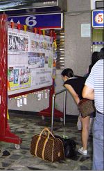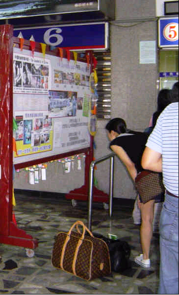 ![]() 购票旅客观看希望墙上的谴责活摘器官海报 |