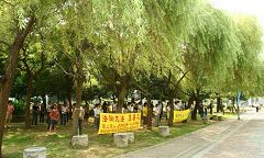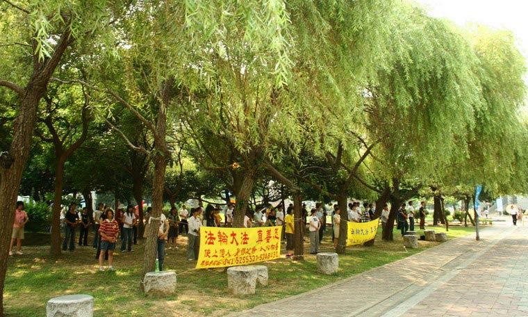 营队第一天先至清华大学报到,年轻的法轮功学员们不畏酷暑,在烈日下仍坚持在学生餐厅对面的溜冰场炼功,希望能让从北京清华大学等校来的交换学生们看到法轮功的祥和美好,让他们了解法轮功在中国无辜遭受人权迫害的真相。