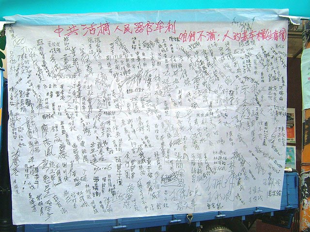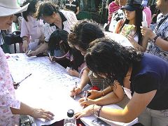 7月初,加拿大前亚太司司长、前资深国会议员大卫•乔高(David Kilgour)和国际人权律师大卫•麦塔斯(David Matas)组成的独立调查组经过两个月的调查、取证,发布了调查报告,确认中共活摘法轮功学员器官真实存在。学员们将此讯息的真相材料一一分送给蓝染节的参观游客,多数游客都被这残酷事实所震惊。经过学员进一步解说,签名的人潮一波波涌来,明白真相的人们甚至排着队等候签名,共同制止这令人发指的暴行。