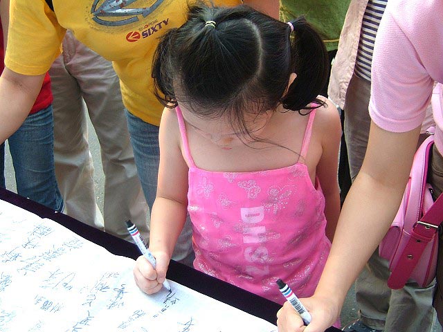 活动中,有许多小孩也随着父母长辈签下名,为支持正义贡献一份力量,虽然年纪小,但他们都很认真的在征签布条上一笔一划仔细签下自己的名字,因为他们知道这是在救人。有些年纪大的阿妈也想签名,却不会写字,只好画一条线代表,真诚的心,代表了善良人们对中共暴行的严厉谴责。