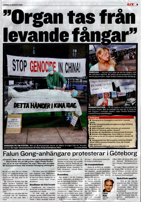 瑞典主流媒体之一的哥德堡晚报(GT)于2006年8月12日,在周六版封面导读部份和第九版的整版,刊登了记者拉斯若德的文章,对中共盗取法轮功学员人体器官的罪行进行了重点报道。文章摘译如下: