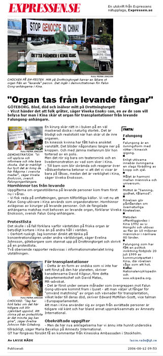 ![]() 哥德堡晚报整版刊登了中共活体摘器官的文章 | ![]() Express报也做了报道 |