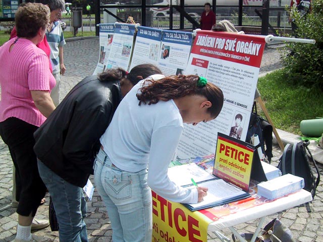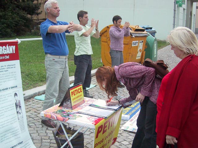 学员们散发传单、与民众交谈,并请人们在向捷克总理和总统递交的请愿信上签名。请愿信的内容是要求国际社会立即对那些被指控涉及活摘器官的中共监狱、劳教所和医院等展开调查。