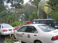 ![]() 法轮功学员仅仅在初级法庭外让记者拍照,过马路后被近十个便衣包围,收走展板 | ![]() 多辆警车(包括抓人的警车)在中领馆外秘密守候,而领馆外共只有2、3个法轮功学员 |