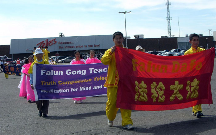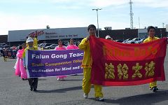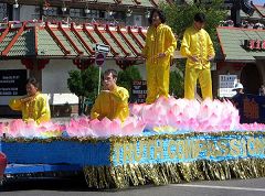 几十支队伍参加了此次游行。法轮大法队伍以横幅开道,其后身着粉色纱裙的仙女队犹如春日桃花,在“普度”的音乐声中翩翩起舞;莲花车上,功法演示柔缓舒展,安静祥和。所到之处,观众热烈鼓掌,惊叹之声不绝于耳,“哇,太美了!””棒极了!”
