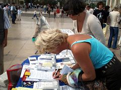 现场摆放的真相展板上列举了大量的中共迫害法轮功的证据及证人对中共灭绝集中营的指证,许多了解真相的行人被中共这种野蛮行径所震惊,无法容忍这些毫无人性的行为,纷纷表示谴责,许多人签名声援法轮功学员。人们都表示这样的活动非常好,应该继续下去,让更多的人知道所发生的一切。