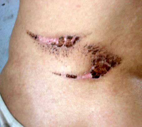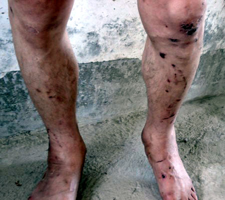 ![]() 李世刚的腿部多处被打坏 | ![]() 李世刚的腰部伤痕仍清晰可见 |