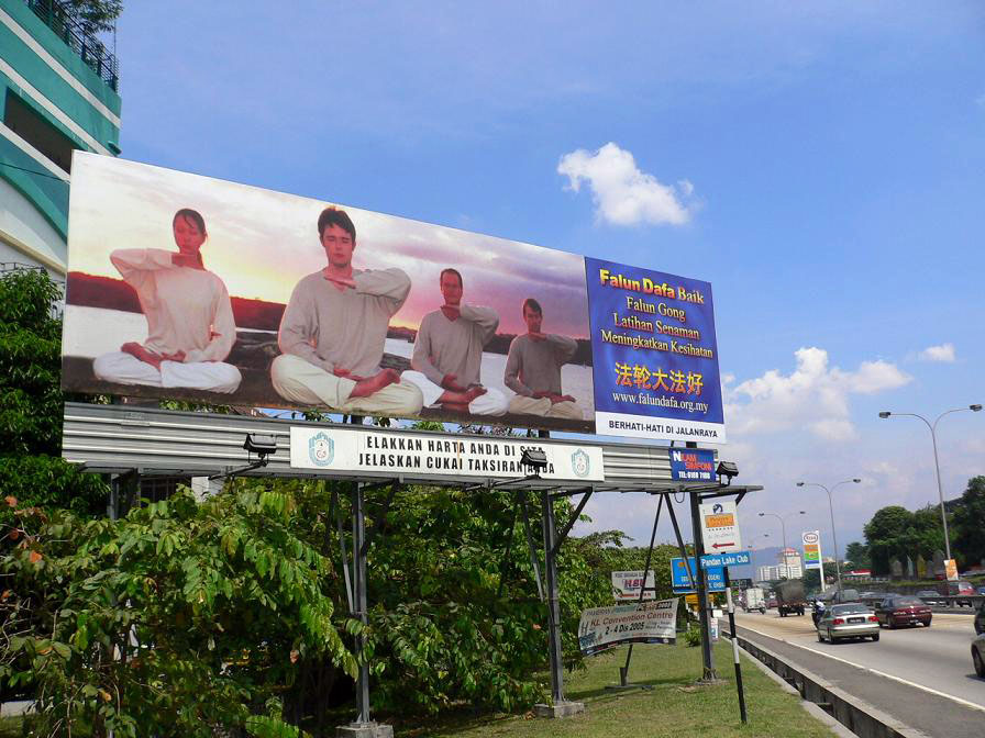 2.2004年1月,衔接马来西亚南北各大州的南北大道旁的巨型洪法广告牌被当局以不合理的方式拆下。一般情况下,广告公司都会在市政局的口头应允后先竖立广告牌,然后再等市政局的批文。法轮功学员的洪法广告牌也在同样的情况下先放上去了,但后来广告公司却被勒令把广告撤下。