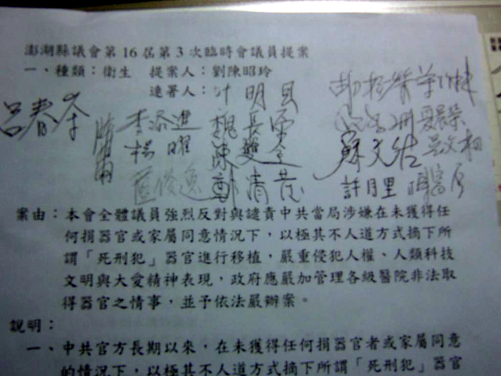 澎湖法轮功学员在提案前一一拜访议员讲清真相,绝大多数议员都在“法轮功受迫害真相联合调查团”征集签名表中签名,表达对中共活摘器官事件的关注。澎湖当地从立委到县长、卫生局都已知道此事,许多乡长、村长、里长也都签名支持制止中共暴行,人们已经看清了中共的邪恶本质。