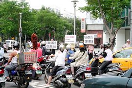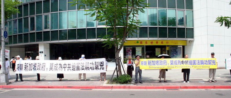 这是继法轮功学员代表明居正七月廿日就新加坡学员被起诉一案,前往新加坡在台办事处递交抗议信后,又一次台湾法轮功学员对新加坡政府的抗议。
