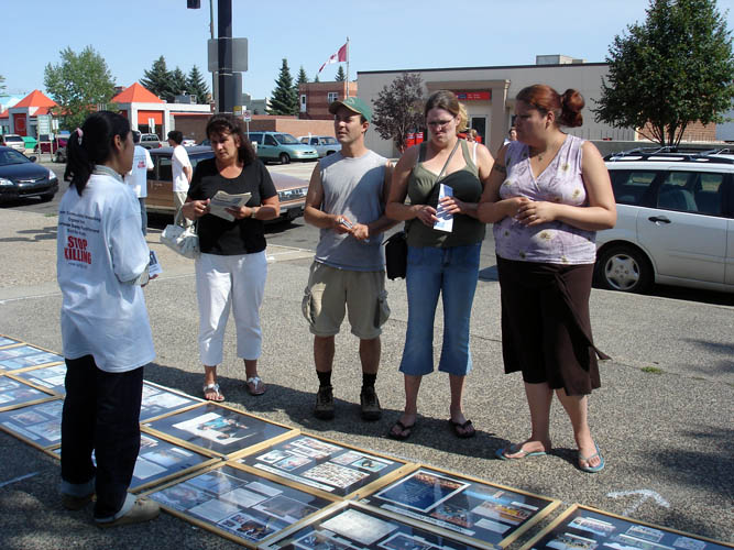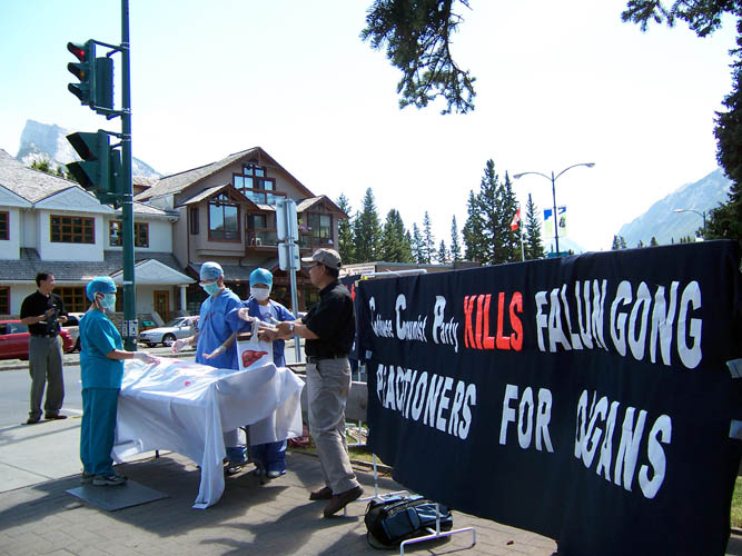向人们讲述中共法轮功的真相 |   在Banff以模拟演示的方式 揭露中共活体摘取法轮功学员器官 |