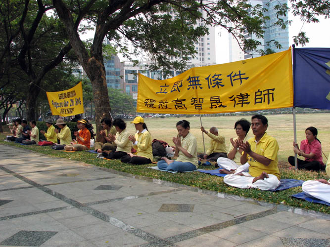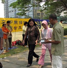 五日上午十点半,法轮功学员陆续来到中国驻雅加达大使馆前,拉开“法轮大法好”和“立即无条件释放高智晟律师”等横幅。整个活动中,法轮功学员炼功打坐,平静而祥和,吸引了路过行人的目光和过往车辆的驻足,一些人还主动索取学员发的真相资料。