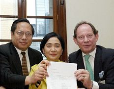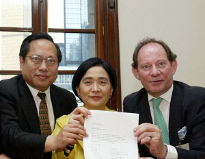 ![]() 爱德华•麦克米兰-斯考特(右一)与多名香港立法会议员, 包括何俊仁(左一)和刘慧卿(中),签署联合声明,促请中共政权重视人权。 |
