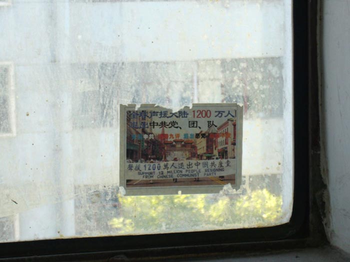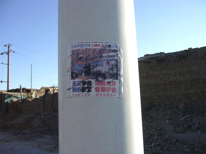 社区干事对世人讲:“法轮功势头真大,两个小时不到,整个市区电线杆就贴满了不干胶。”