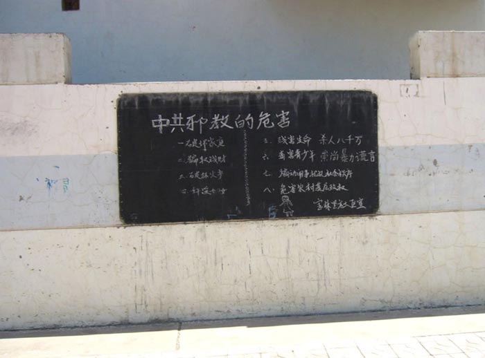 8月底,各社区在社区宣传栏上,写诬蔑大法的标语。大法弟子们认识到不能允许邪恶操控世人害人,于是同修们制作了曝光中共是邪教的不干胶,到处张贴,大量发劝善信,现在社区宣传栏上全部诬蔑内容已换下。