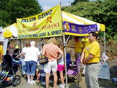 一家祖母、父母和两个领养的中国孩子来到摊位前,他们说是在为孩子们寻根来了。当他们知道了“真、善、忍”的美好,中共对中国法轮功学员的残酷迫害后,表示会参加在新港图书馆的免费教功活动,他们要让孩子们学到真正的中国文化。
