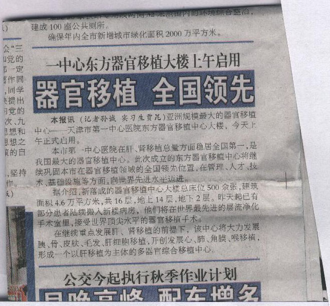 天津《今晚报》刊登了今年8月底,天津东方器官移植中心大楼正式启用的消息,预示更多的移植手术和更多的盗取被无辜杀害者的器官。望有心人密切关注东方器官移植中心的器官移植线索,共同制止中共对法轮功学员和无辜人士的虐杀和盗取他们的器官。