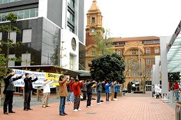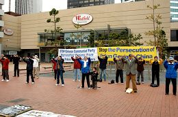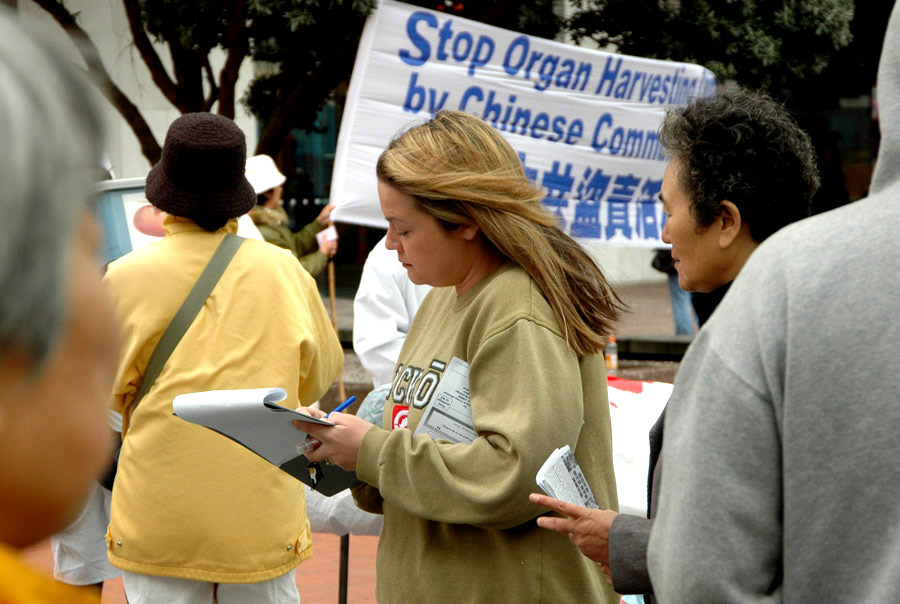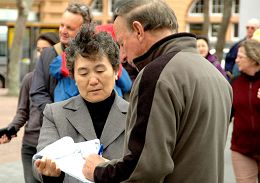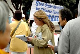 许多路人纷纷驻足观看真相展板,学员们将真相传单分发给人们,并详细地讲述中共对法轮功学员迫害的真相。人们对中共迫害信仰真善忍的民众非常震惊,纷纷签名要求停止迫害。