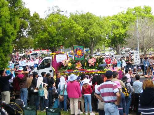 连续六年参加花车游行的法轮功团体,今年的花车造型布置及队伍安排更是优雅创新。花车上除了布满五颜六色的鲜花盆栽外,法轮功学员们还亲手制作了许多象征纯净圣洁的纸莲花,分别成串垂挂在车头,以及绑在车身排出FALUN DAFA(法轮大法)的字样。色彩鲜明的法轮图形及横幅高挂在花车中央,三位可爱的法轮功小弟子静坐于巨型莲花座上。