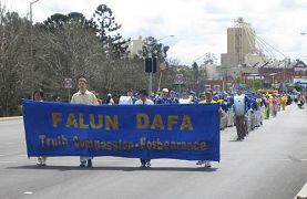游行于中午十二点开始,人数最多的法轮功队伍,由写着“法轮大法好”的横幅,《转法轮》巨书模型和花车带领前进。队伍阵容包括:各类仙女队、天国乐队、腰鼓队等。一路上处处围满了观众,花车队伍所到之处,不断的能听到阵阵掌声及欢呼声。当队伍通过主席台时,司仪大声的向观众说:“请以热烈的掌声欢迎法轮大法团体,看来他们是游行队伍中拥有人数最多的团体,真是太好了,谢谢他们为我们带来许多美丽的服装与动听的音乐。”司仪也向来宾们介绍了法轮大法以及图文巴市炼功点的时间地点。