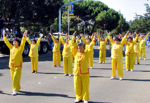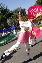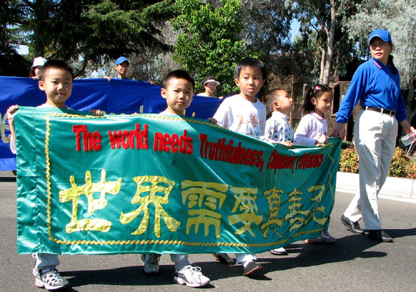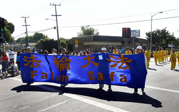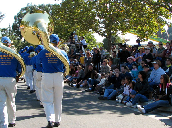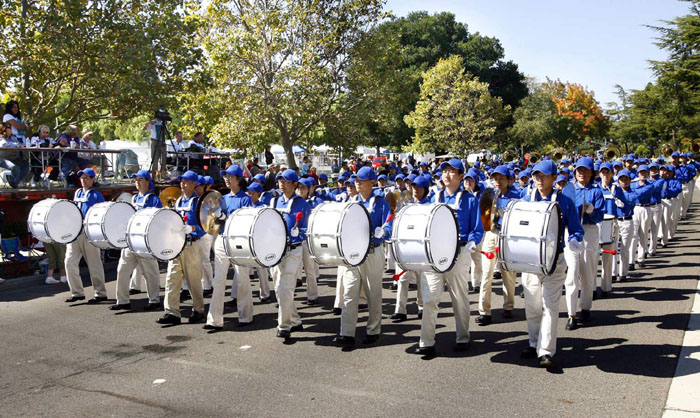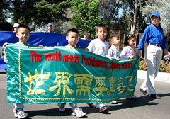![]() 法轮功队伍 | ![]() 阵容整齐、醒目的美西天国乐团 |