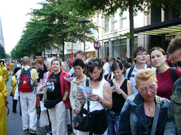 游行吸引了成千上万的观众,很多人都仔细阅读法轮功真相资料