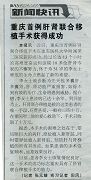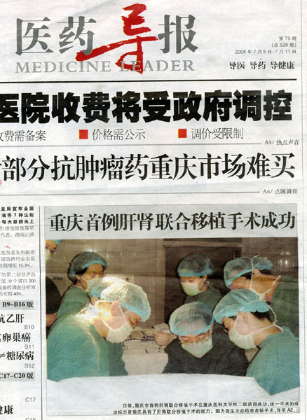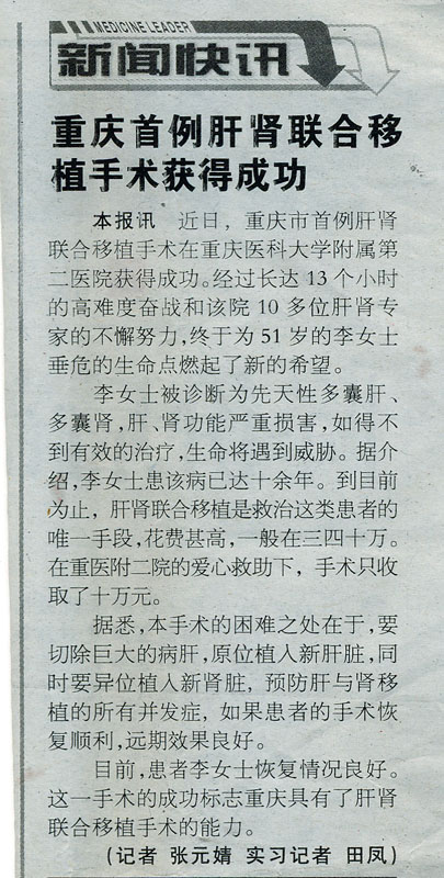 2006年7月5日-7月11日《医学导报》第75期报道题为《重庆首例肝肾联合移植手术获得成功》的文章。文章中说,重庆首例肝肾联合移植在重庆医科大学附属第二医院有10多位肝肾“专家”参与,手术达13小时。患者为李女士,51岁。肝和肾的供体情况被略去。
