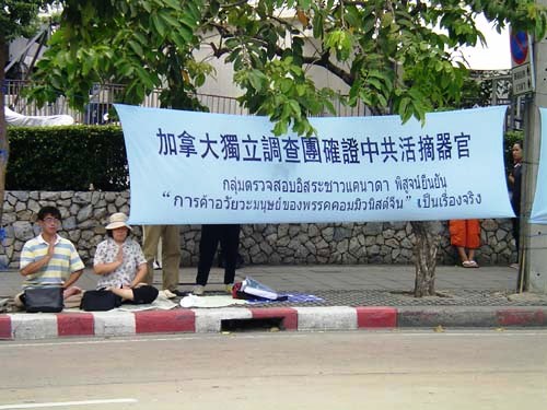 法轮功学员在中使馆对面挂起了“声援一千三百万人退!党!”、“声援袁胜机长、高智晟律师”、“加拿大独立调查团确证中共活摘器官”等横幅,在声援中国大陆一千三百万勇士退出中共、谴责中共活摘器官的同时,强烈抗议中共打压退!党!和传播·九·评*,并声援袁胜和最近被中共非法抓捕的、曾调查中共迫害法轮功真相的维权律师高智晟。