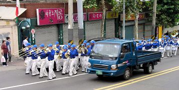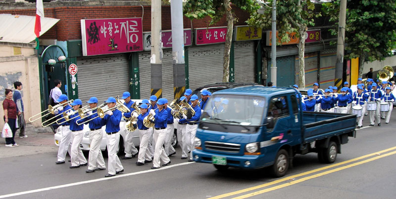 韩国“天国乐团”演奏了“法轮大法好”、“法鼓法号震十方”等,随着震撼人心的鼓号声的行進,所到之处,街上行人都纷纷驻足观看,沿途的工作人员及商家和店铺员工也都跑出来观看,他们的表情也在不断的变化着,由惊愕到轻轻点头,鼓掌,有的则拿出手机、照像机、摄像机,拍下这难得的珍贵镜头。还有的在互相议论:法轮功太了不起了。