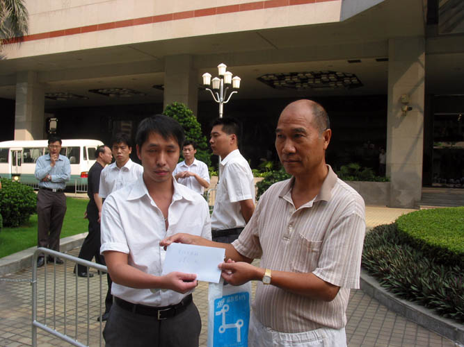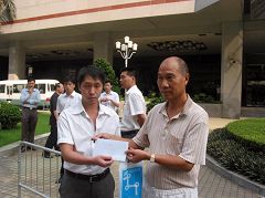 ![]() 法轮功学员(右)递交公开信给对方代表(左) |