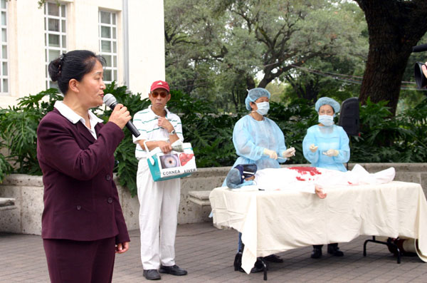 新闻发布会现场,有揭露活摘器官的模拟演示,有各种呼吁“制止中共活摘器官”的横幅。从外地专程赶来的王文怡女士宣读了致休斯顿市长比尔•怀特先生的一封信,呼吁市长关注在中国发生的活摘器官的暴行。她主要讲述:自从一九九九年七月二十日开始,中共全面性的迫害法轮功,拘留中心关押了难以计数的法轮功学员;据一名嫁给医生的证人说,她的先生在中国北方沈阳市一处集中营工作时,曾摘取了约两千名法轮功学员的眼角膜。这些法轮功学员在经过其它器官摘取的手术后,没有一人存活。自一九九九年七月开始,七年以来,数百万法轮功学员遭到中共非法关押、罚款、殴打、酷刑折磨等迫害;经查实的已有近三千名大陆法轮功学员被迫害致死;中共活体摘取法轮功学员器官贩卖谋利、焚尸灭迹的暴行,震惊了世界,也彻底暴露了中共的邪恶本质。