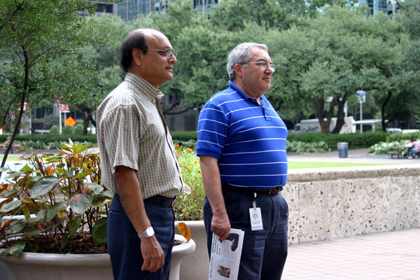 中午十一点半至十二点半,休士顿学员在市政府前举行新闻发布会。发布会前,曾在白宫喊话的医学博士王文怡与另一法轮功学员进入市政府办公室内,与工作人员交谈。随后,西班牙语电视台采访了她。