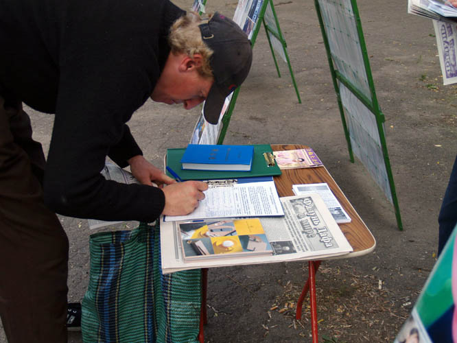 当天活动在市中心的普希金公园举行。活动期间,学员们挂出了醒目的“法轮大法”横幅,下面写有俄语的“真、善、忍”,还有介绍法轮大法在世界洪传的展板,以及大法弟子在中国遭受迫害、被活体摘取器官的图片。在展板旁有两张桌子,一个是供明白真相的世人签名用,一个是专门为小朋友做纸莲花用。