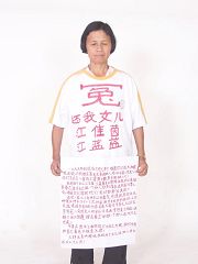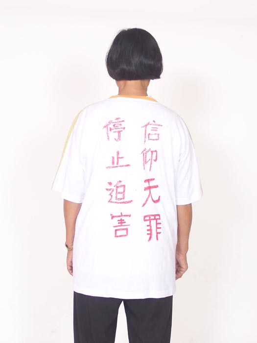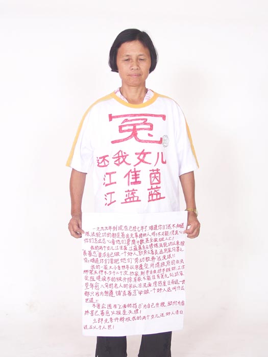 9月22日上午,大法弟子江蓝蓝的母亲和吴锡源的亲人到广东三水劳教所要人,三水劳教所恶警管教看到江蓝蓝的母亲身上的T恤上写着一个大大的“冤”字和“还我女儿江佳茵、江蓝蓝”“信仰无罪、停止迫害”字样和展板,非常害怕,立即召集了20多人抢走展板,并强行脱去了江妈妈的T恤,恶警还威胁说:“你如果在别处这样做要判你几年刑。”
