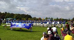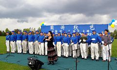 活动圆满结束,大家正在散开,天上的雨突然倾盆而下,旁边一个巨型亭子下立即挤满了避雨的人。部份天国乐团的成员在亭子里又奏起了《法轮大法好》。有学员笑得很开怀,有学员眼里泛起了泪光。
