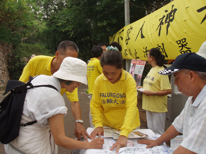 来自新竹县市的四十多名法轮功学员带着真相资料及横幅,登上三百级石阶上的幸福亭,展开向来自四面八方的游客诉说大陆活摘法轮功学员器官,贩卖到全世界赚取黑心钱的不人道行为,及迫害无辜老百姓的暴行。