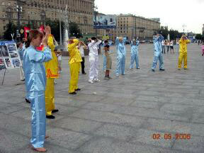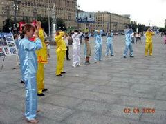 已经阴沉了一周的天气在当天突然变晴,真相展板和横幅整齐的摆放在音乐喷泉的前面,显的格外的肃穆。穿着黄色和蓝色炼功服的学员向观众展示五套功法。