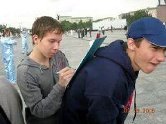 ![]() 游人认真读着学员派发的法轮功真相资料 |