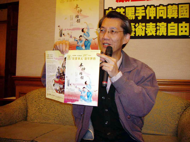 “中共居然会怕一群穿着漂亮古典服装,跳着曼妙舞蹈的一批人”,台湾新!唐!人:国际文化学会理事长明居正手中拿着新!唐!人:新年晚会的宣传单指着说,号称强大政权的中共害怕这个东西,这是一个什么样的政权?