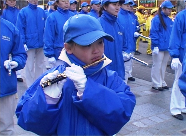 一位站在天国乐团后的法轮功功法演示花车上的学员说,她清楚的听到有中国人不断的高喊着:“谢谢你们,谢谢你们!”这一定是乐团中众多中国人面孔,也使这位同胞产生了自豪感吧。同时她还看到人们不断的热烈鼓掌。