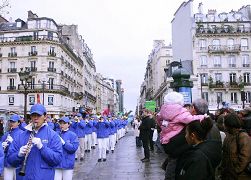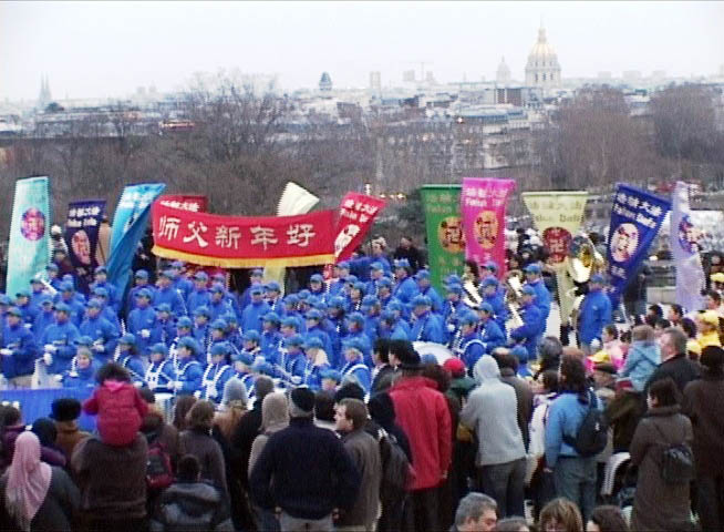 零七年一月一日下午,巴黎埃菲尔铁塔对面的广场举行了零六、零七巴黎游行节的表演活动,欧洲天国乐团是诸多表演团队中声势最大的——一百六十多人、成员来自国家最多——十几个国家、年龄跨度最大——从九岁儿童到七十高龄老翁、也是组建时间最短的乐队,但却得到最热烈的欢迎,欧洲乐团表演后,主持人高声说:谢谢法轮大法!接着法轮功学员又多次为观众演奏,里三层外三层的观众将乐团紧紧围着。