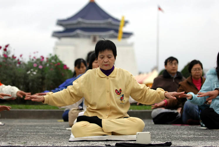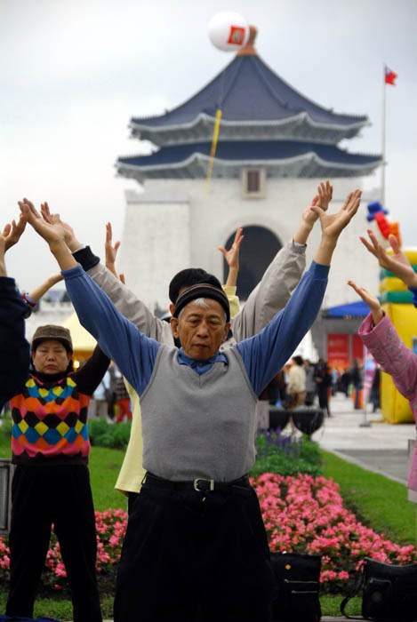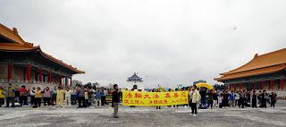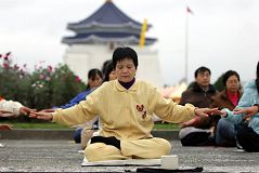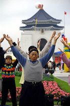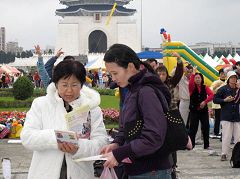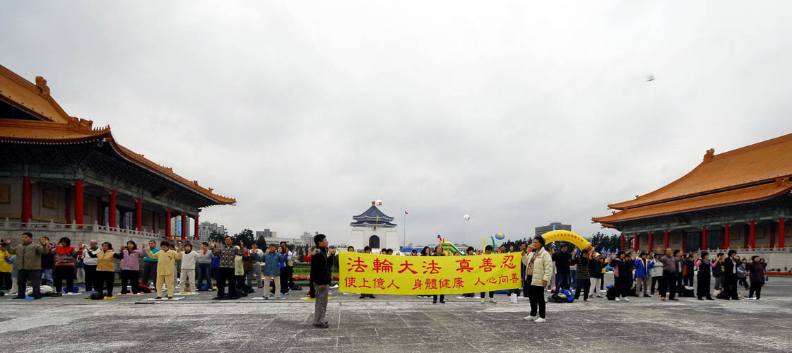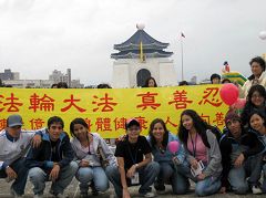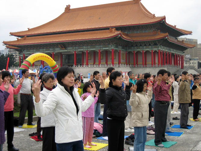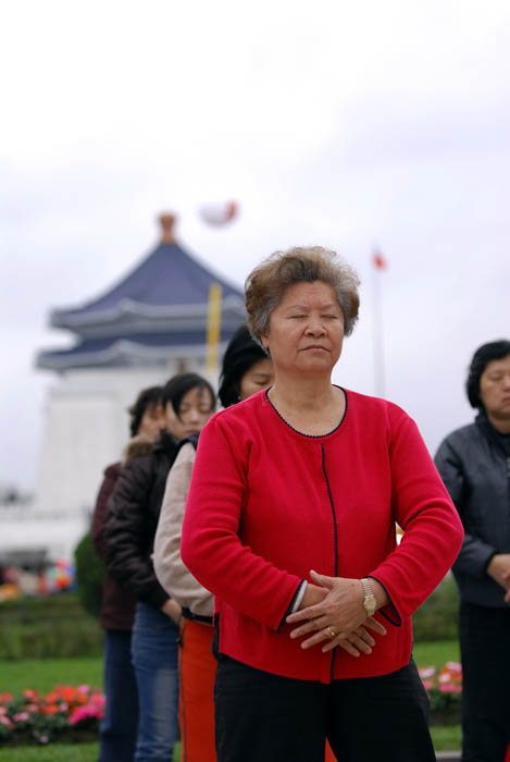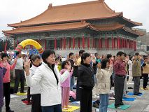 为了让更多的民众见证法轮大法的美好,二零零七年一月十三日,冬日的台北午后,一群法轮功学员扶老携幼的到台北著名的旅游景点--中正纪念堂炼功洪法。